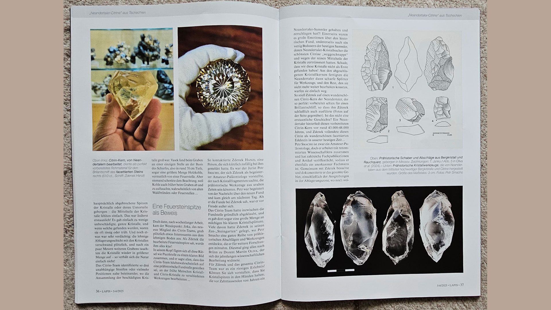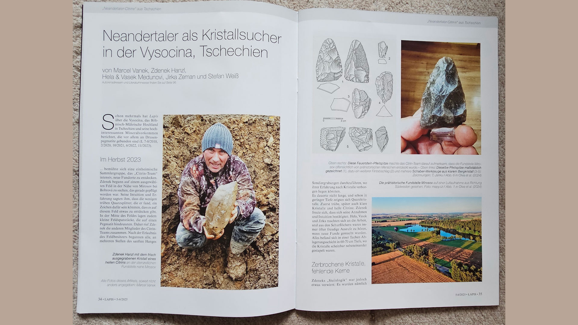 V červnovém Lapisu nám vyšel tak trochu „jiný“ článek o minerálech Vysočiny. Citrín parta totiž našla další zajímavé naleziště, ale něco na něm bylo podivné… Našlo se totiž veliké množství rozbitých krystalů křišťálů a citrínů, kde chyběl střed. Všude zbyly jenom „hlavičky“ krystalů a „nožky“, ale středy prostě chyběly. A když se vykopal opracovaný pazourek, tak hned bylo jasno! Tady řádili pravěcí sběratelé…