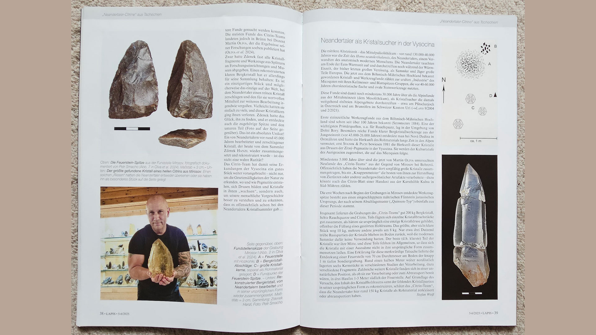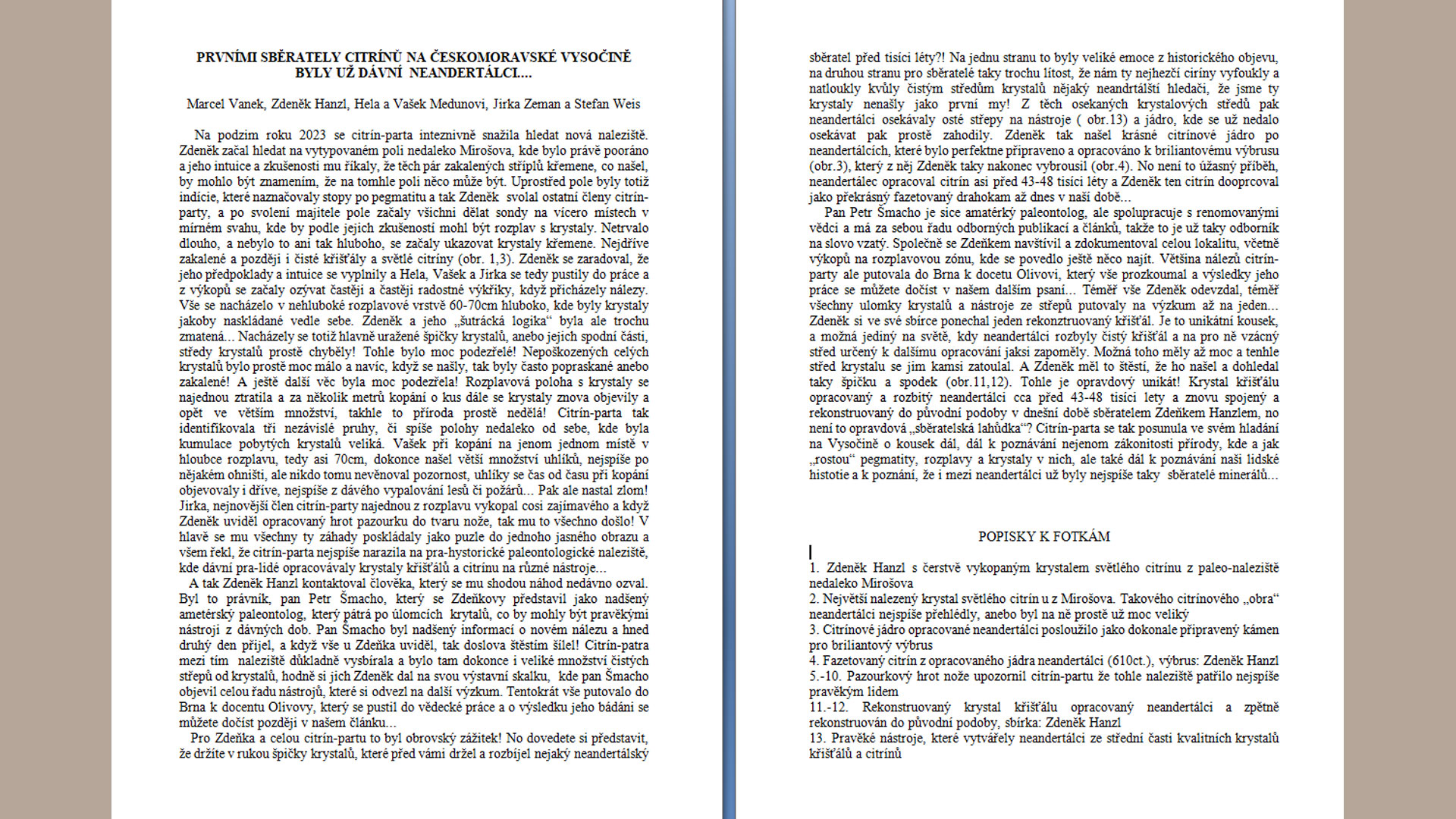 Ve fotogalerie přikládáme i článek v češtině pro ty, kteří moc neumějí německy. A také jednu fotku toho unikátního krystalu, který odborně „naformátovali“ samotní neandertálci…