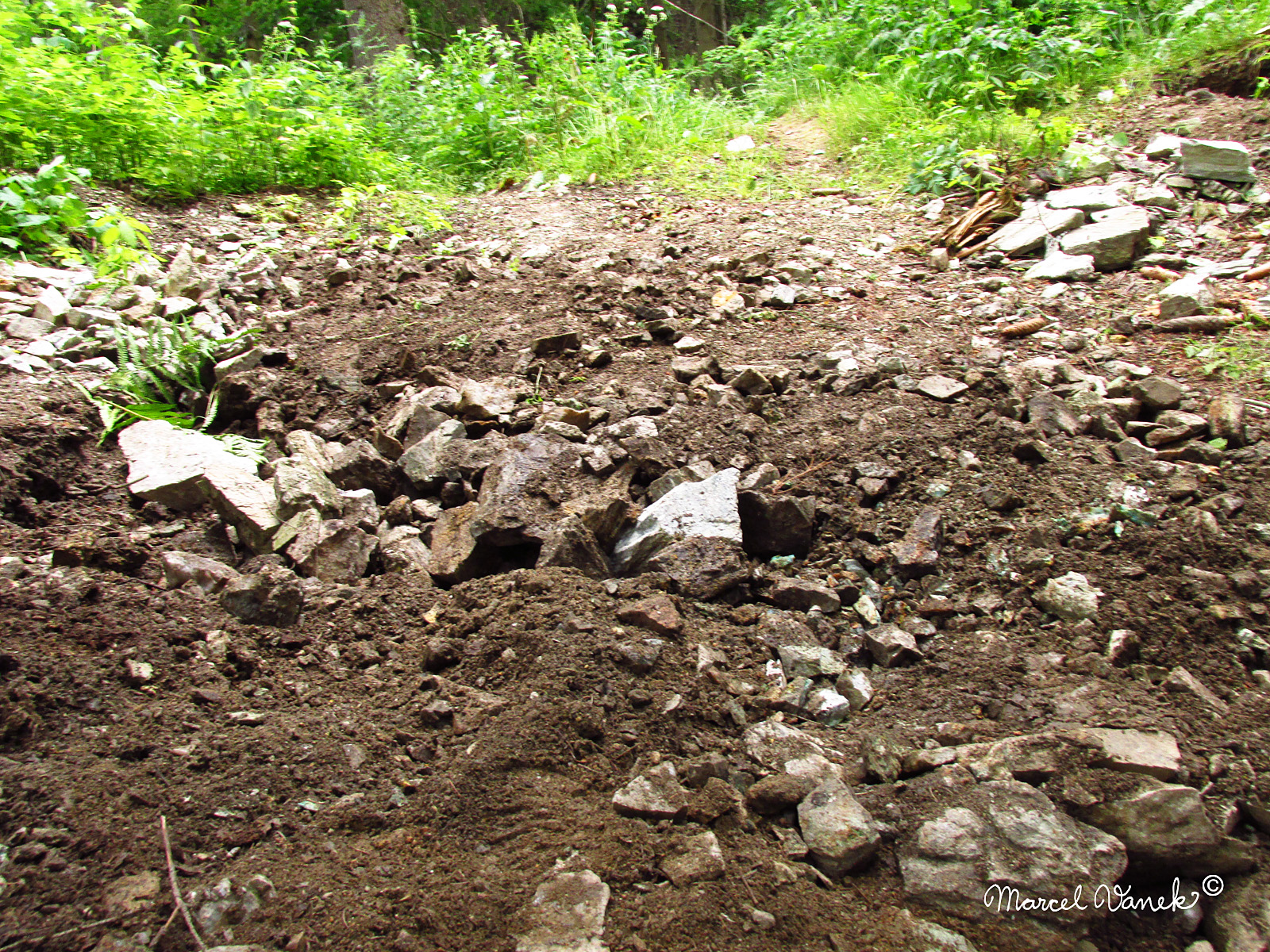 Druhá halda je mnohem větší a motorkáři si tady vytvořili dráhu, na které najdeme občas zelené kamínky, co vyhrabaly jejich pneumatiky. Já měl nálezy hlavně v horní části hald, kde bylo zeleně nejvíce. Tady se chryzokol nalézá mnohem častěji než na maličké haldičce plné smetí. Chryzokolu je tady více a ve velice pestré nabídce, ale hemimorfitu jsem tady našel mnohem méně. Nicméně na obou zarostlých haldičkách je nálezů veliké množství, což se v dnešní době nedá říct o všech lokalitách. Navíc jsou tady popisovány i další vzácnosti, které jsem já sice nenašel, ale kdo ví, třeba čekají na vás … Popisují se tady vzácně i drobné drátky ryzího stříbra, ryzí měď, kuprit, cerusit, galenit, mínium a celá řada dalších minerálů …
